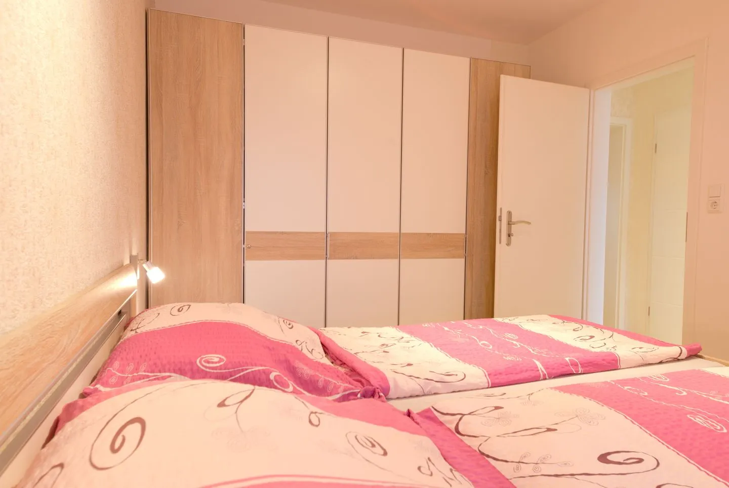Im Schlafzimmer erwartet Sie ein komfortables Doppelbett (180 x 200 cm) und ein großzügiger Kleiderschrank für Ihre Garderobe. Außerdem gibt es Verdunklungsmöglichkeiten.
