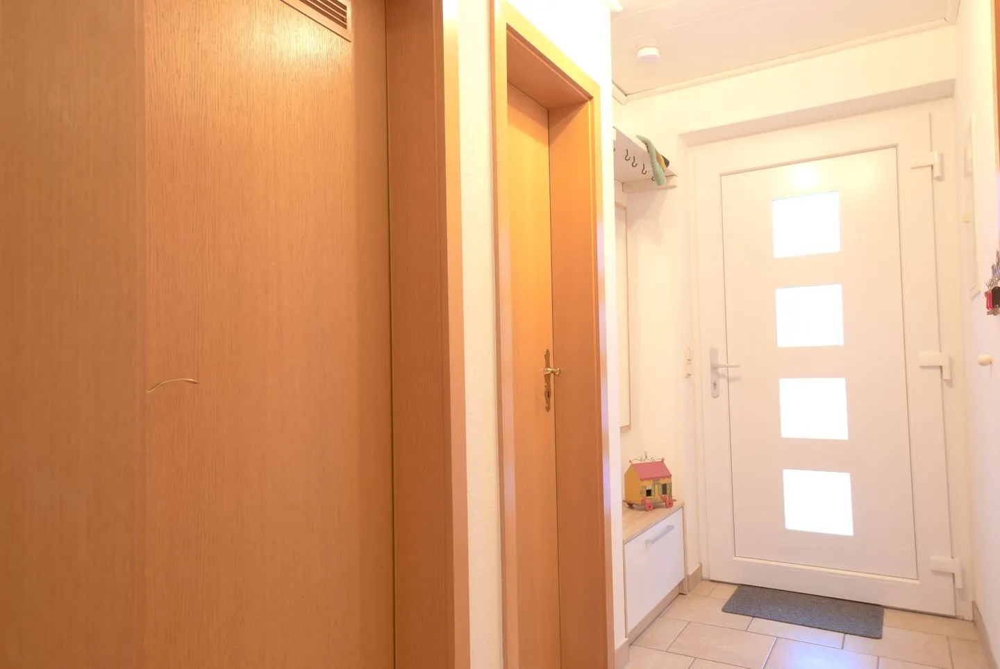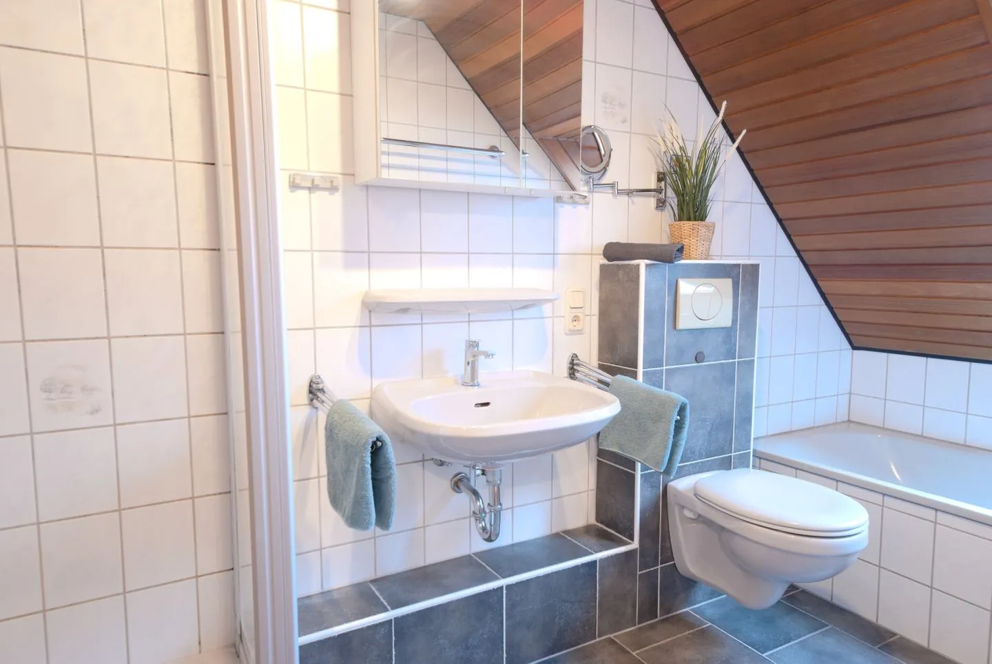 Das helle Badezimmer im Obergeschoss ist mit Dusche, Badewanne, beleuchtetem Schminkspiegel und Fön ausgestattet. Zusätzlich steht im Erdgeschoss ein separates Gäste-WC zur Verfügung.