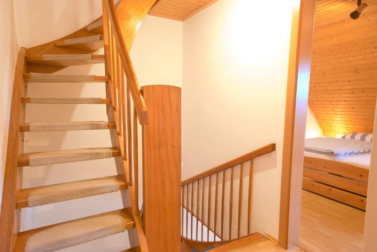 Im Obergeschoss befindet sich ein Doppelschlafzimmer mit zwei Einzelbetten (90 × 200 cm), zusätzlichem Kinderbett und Leseecke sowie ein Einzelschlafzimmer. Das ausgebaute Dachstudio verfügt über ein Einzelbett, ein Zustellbett und einen Schreibtisch und eignet sich besonders für Kinder. Alle Schlafzimmer sind mit Laminatboden und Verdunkelungsrollos ausgestattet.