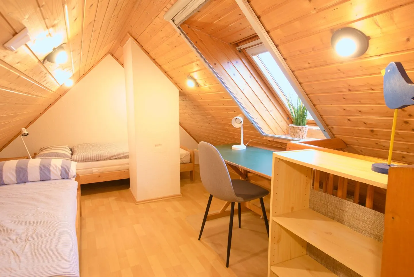 Im Obergeschoss liegen ein Doppelschlafzimmer mit Kinderbett und Leseecke, ein Einzelschlafzimmer sowie ein modernes Bad mit Dusche, Badewanne, beleuchtetem Schminkspiegel und Fön. Das ausgebaute Dachstudio im Spitzboden verfügt über ein Einzel- und ein Zustellbett sowie einen Schreibtisch und ist besonders für Kinder geeignet. WLAN und ein Parkplatz am Haus stehen kostenfrei zur Verfügung.