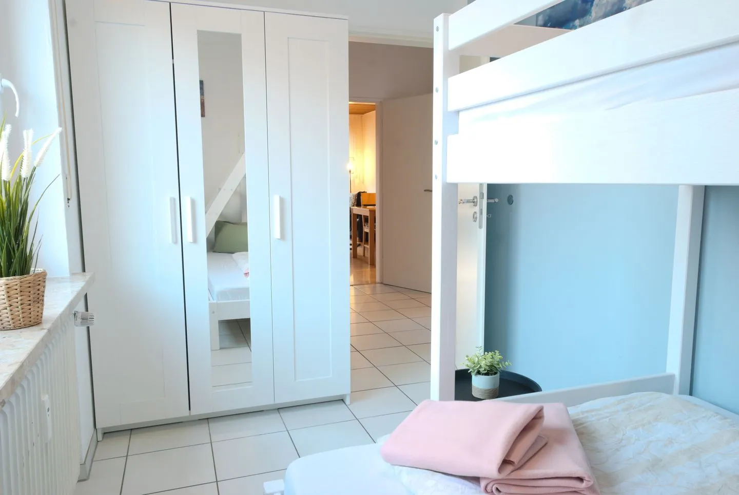 Die Wohnung bietet zwei gemütliche Schlafzimmer. Im ersten Schlafzimmer finden Sie ein komfortables Doppelbett (180 x 200 cm) sowie einen 3-türigen Kleiderschrank. Das zweite Schlafzimmer ist mit einem Etagenbett ( oben 90 x 200 cm, unten 140 x 200 cm) und einem 2-türigen Kleiderschrank ausgestattet. Für Familien mit kleinen Kindern ist es möglich einen Hochstuhl oder Kinderreisebett zu buchen.