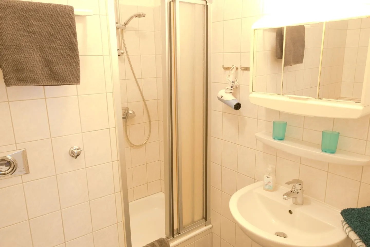 Das Badezimmer verfügt über ein Waschbecken, Dusche, WC, Spiegelschrank und einen Fön.